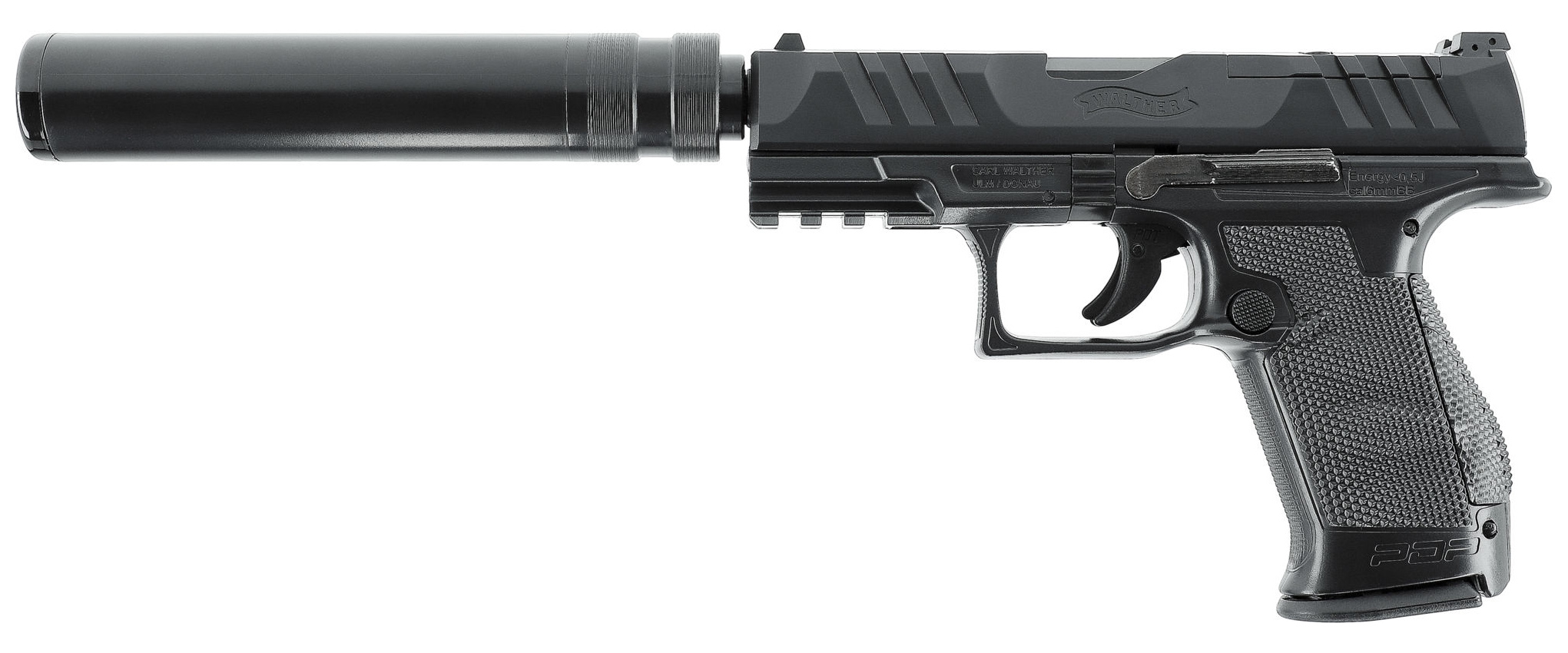 Táto autentická replika známej zbrane ponúka imitáciu tlmiča ako dizajnový aj funkčný prvok, ktorý zároveň predlžuje zbraň na celkovú dĺžku 345 mm.